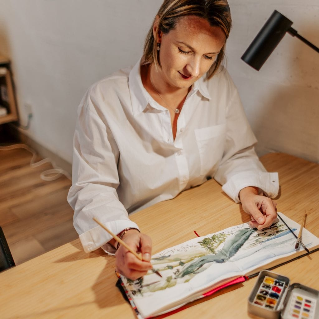 L’aquarelle est pour moi un moyen d’allier spontanéité et précision, en capturant l’essence d’un lieu avec finesse et sensibilité. Mon regard d’architecte m’aide à saisir les lignes et les proportions, tandis que l’aquarelle apporte douceur et émotion à chaque illustration.